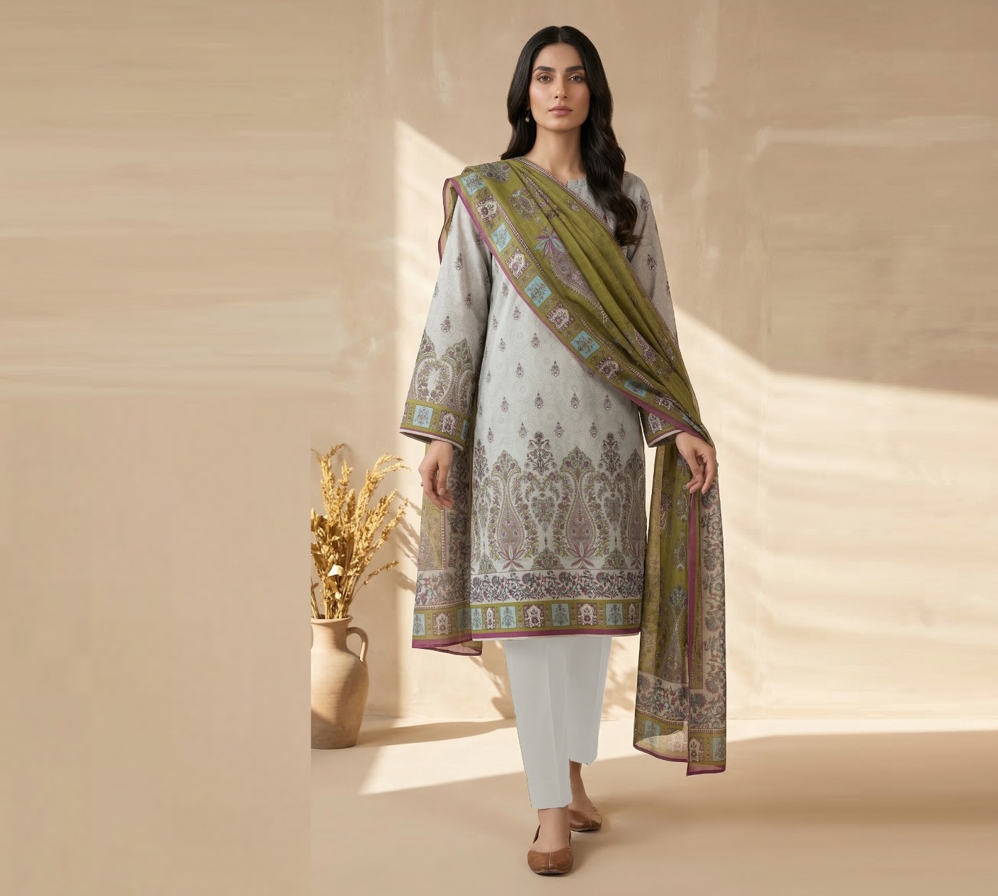 Grey and olive combination with classic prints for a sophisticated style.